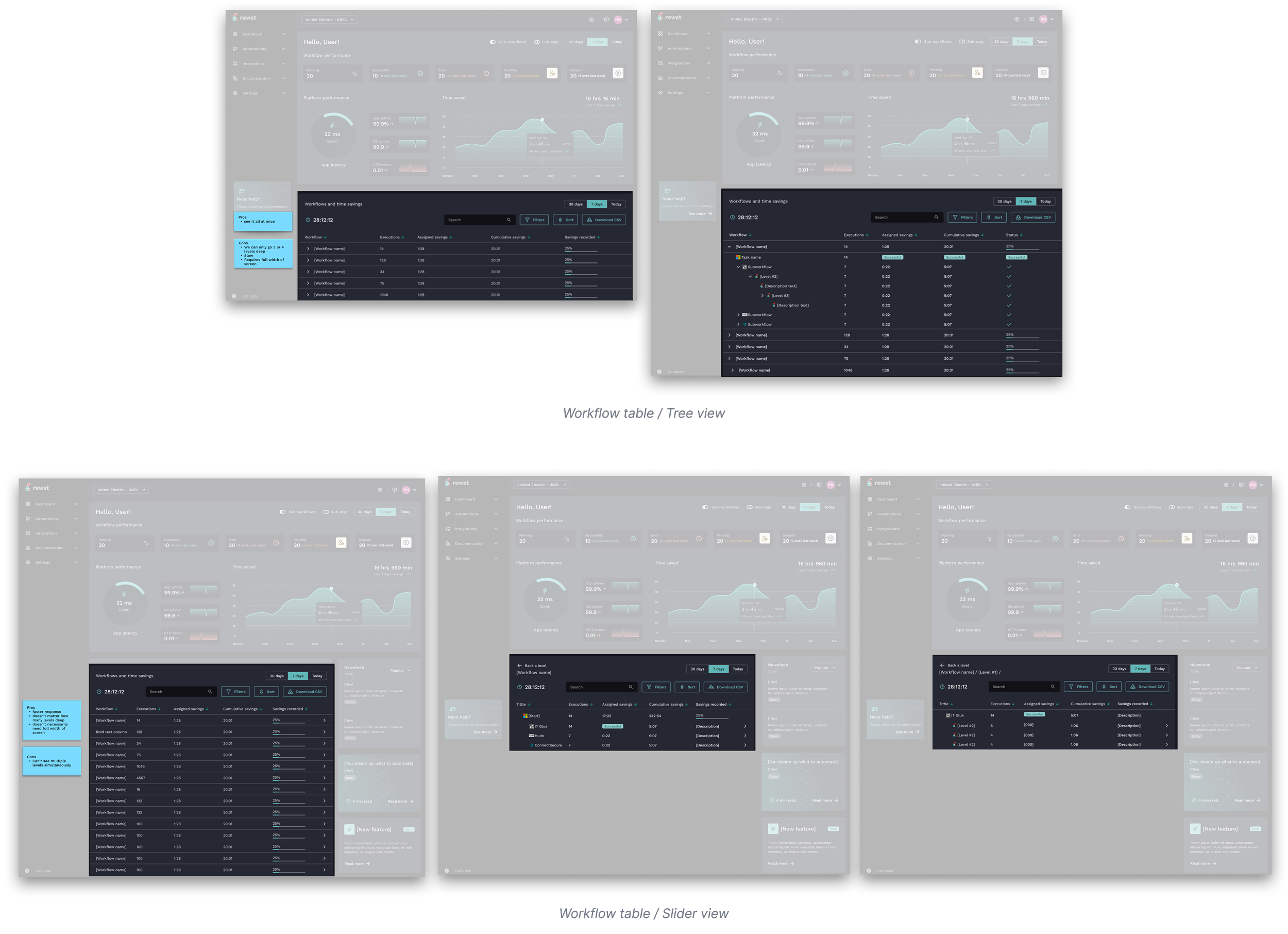 The workflow table required a separate exploration of its own. Sub-workflows mean the data is inherently nested — a flat list wouldn't show the relationships that mattered. Two patterns were built and tested.