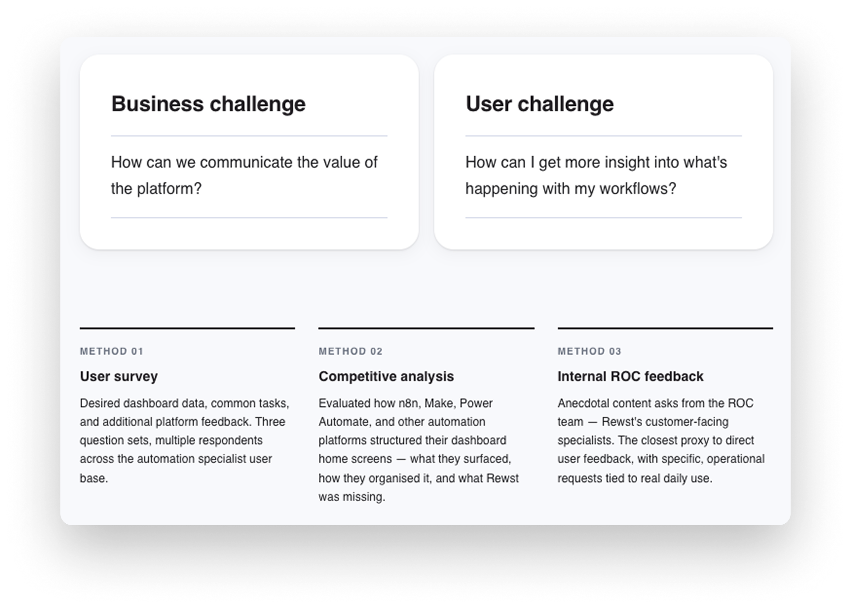Research ran across three methods: a user survey on desired dashboard data and common tasks, a competitive analysis charting how comparable automation platforms structured their home screens, and internal anecdotal feedback collected from the ROC team — Rewst's customer-facing specialists who used the platform daily. Three themes surfaced consistently across all three sources.