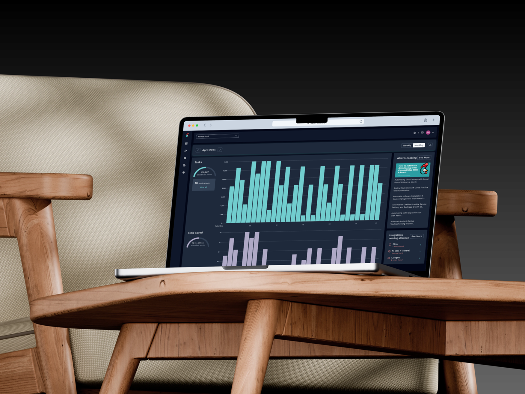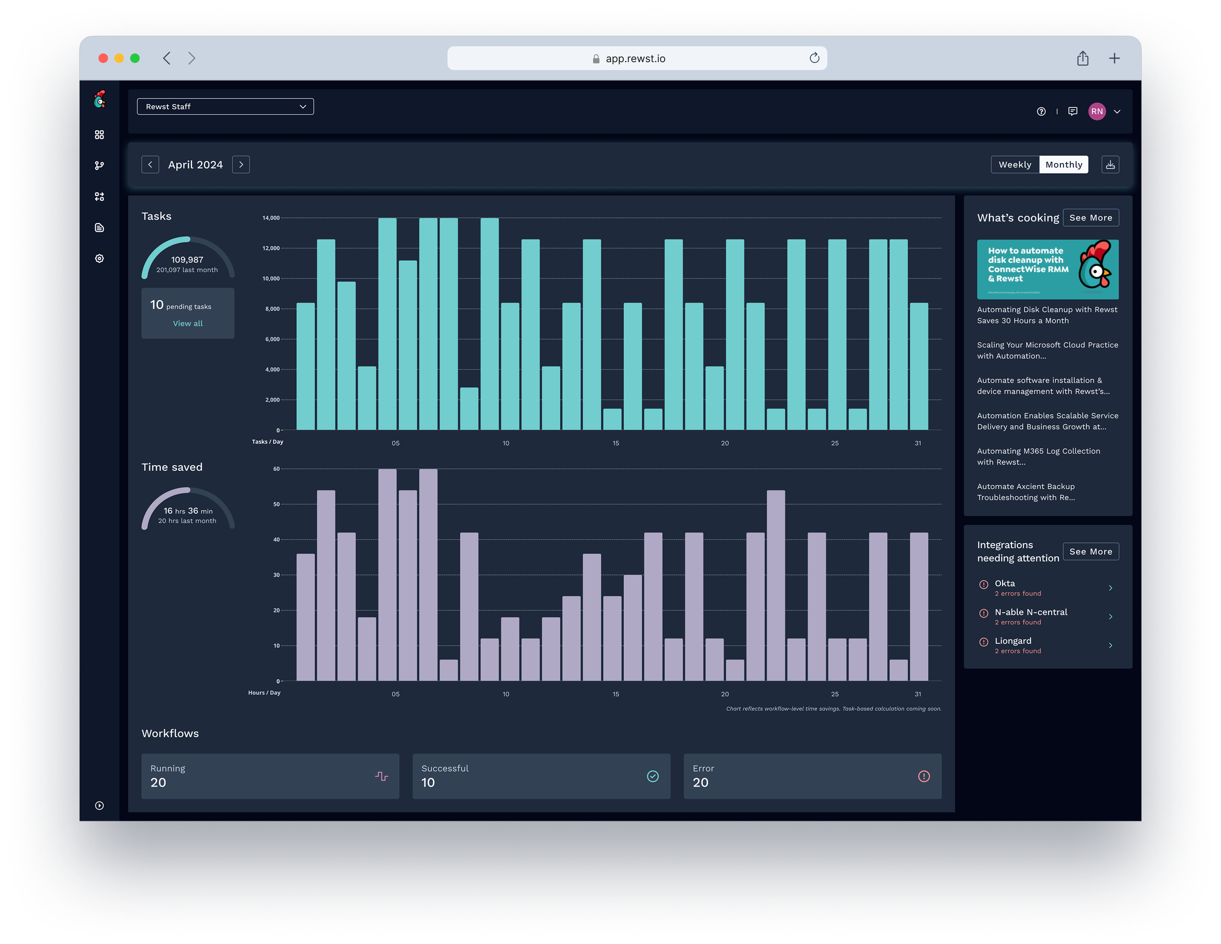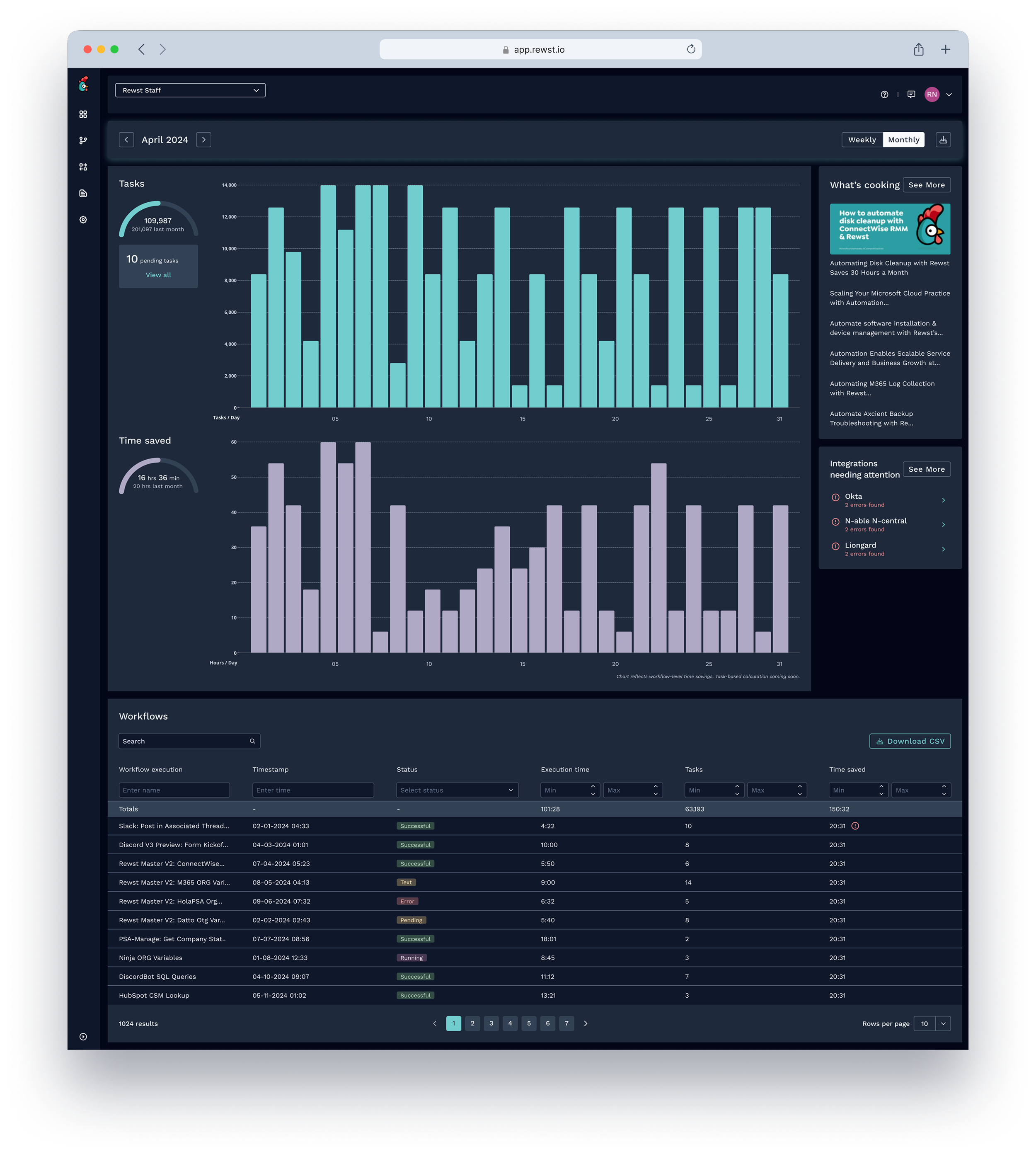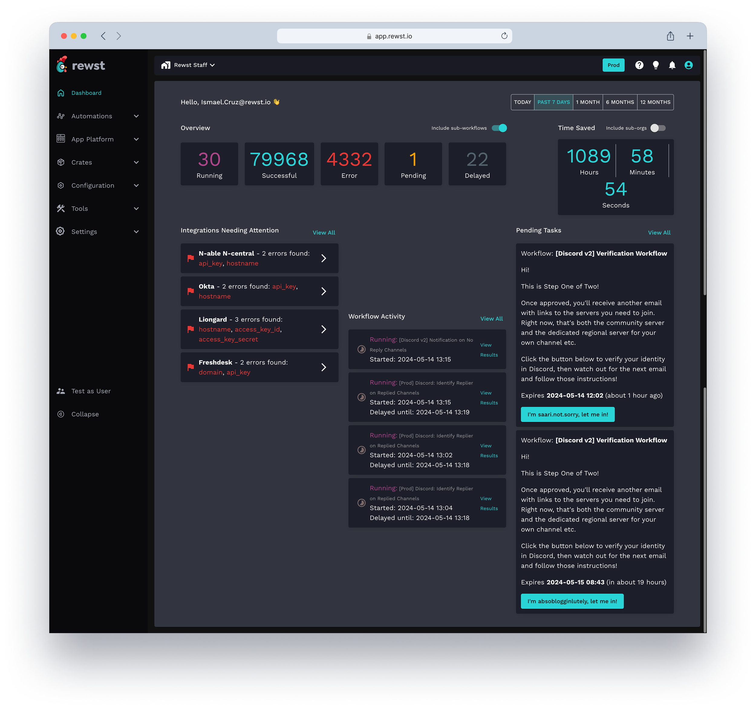 The redesigned dashboard gave Rewst's automation specialists a home screen that reflected the work they were doing and the value they were delivering. For the first time, users could open the platform and immediately answer three questions: are my workflows running correctly, how much time has the platform saved, and is there anything I need to act on right now.