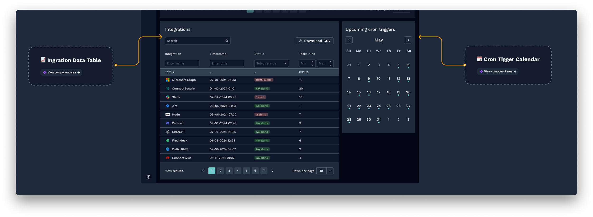 Decision: Integration health and upcoming cron triggers are surfaced as dedicated sections on the dashboard, not buried in separate settings views.