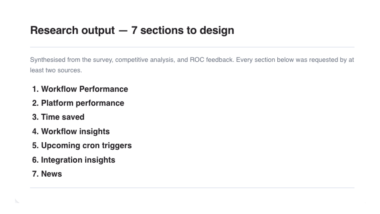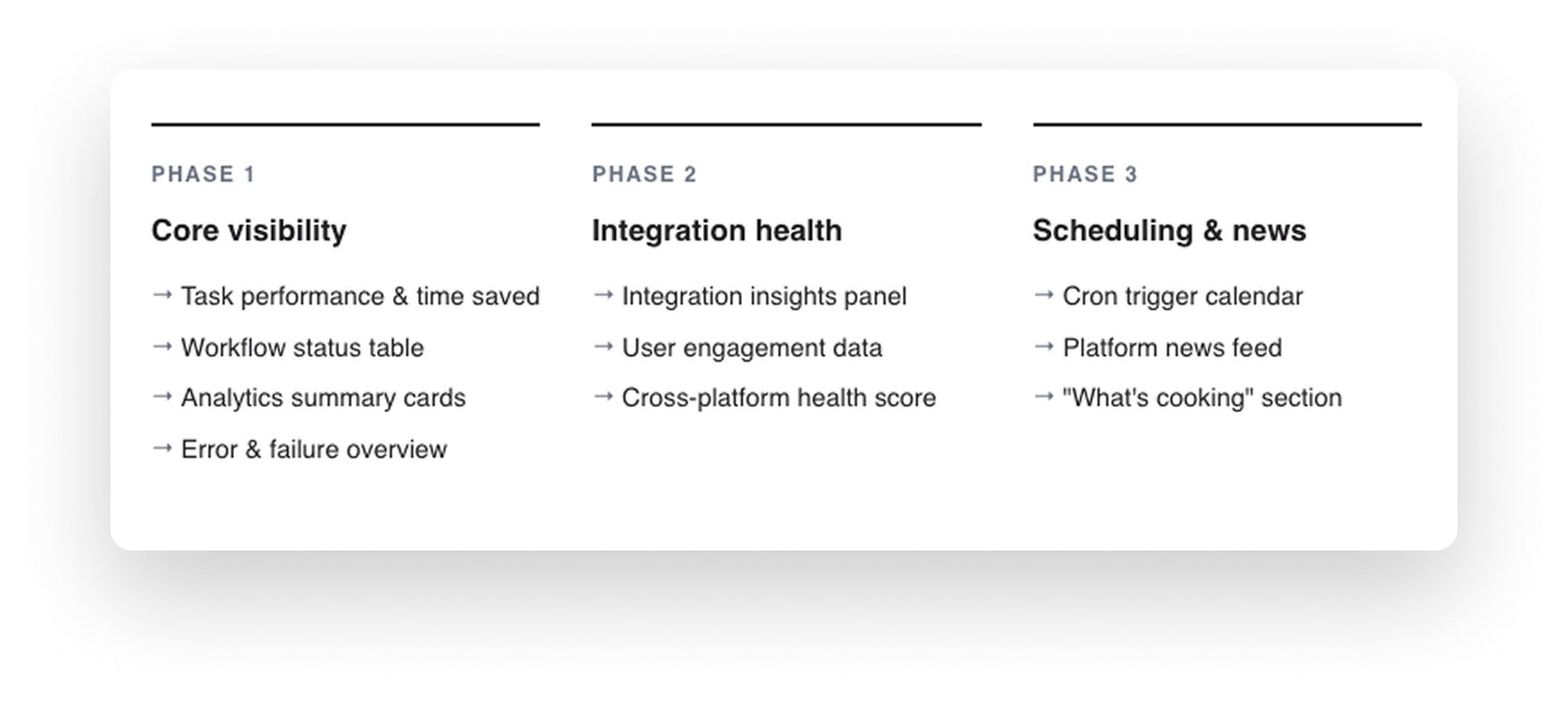 Integrations and the news feed were strong user requests, but deferring them to Phases 2 and 3 meant Phase 1 could land with a tight, trustworthy core: time saved, workflow performance, and error visibility. That sequencing decision came directly from the workshop.