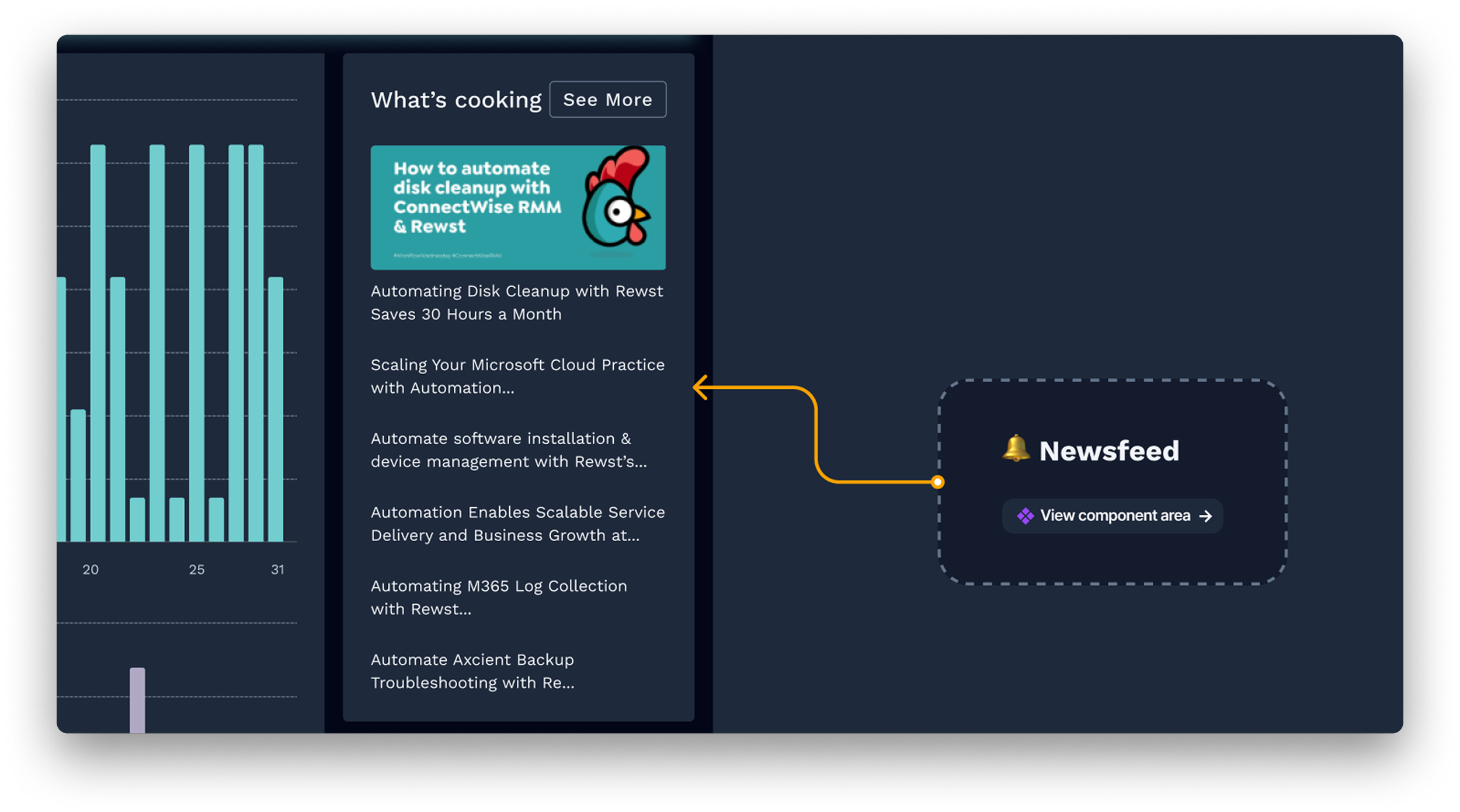 Decision: A "what's cooking" feed shows product updates, new integration releases, and platform news inline on the dashboard.